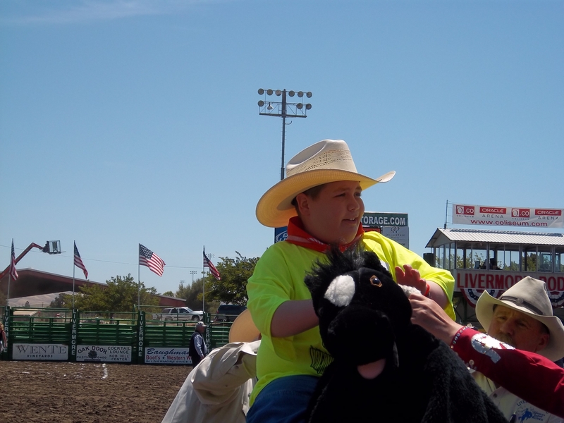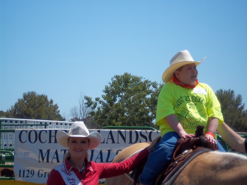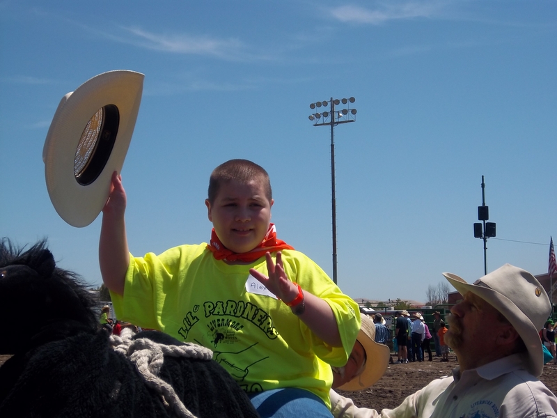 (Posted 6/12/2011) Taken 6/12/2011. Alex at the Lil' Partners Rodeo event. This is a morning for the local special needs kids to show them how to rope steer, ride a bronco, run the barrels, and ride a real horse. It takes place in the rodeo arena on Sunday morning, and then the real rodeo runs in the afternoon. Alex's rodeo partner this year was rodeo queen Missi Elliott. More info is here.