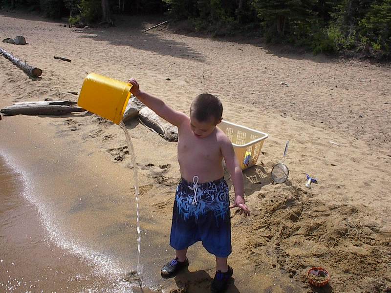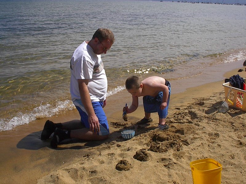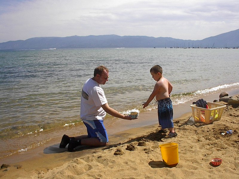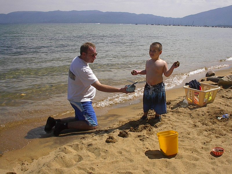 (Posted 8/29/05) Taken 8/14/05. Our first vacation to Jeff's grandparents' cabin in South Lake Tahoe. First exhausted from the road trip. Then having fun at the beach. Finally helping da-da make mud pies.