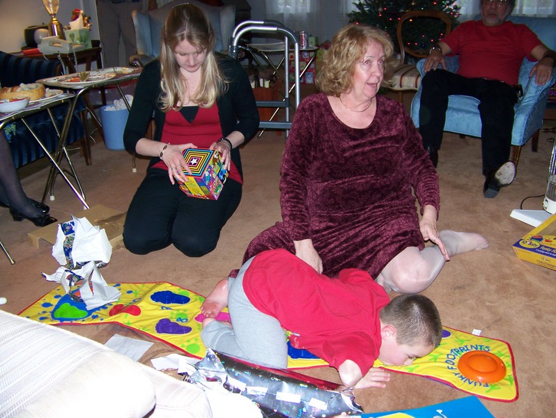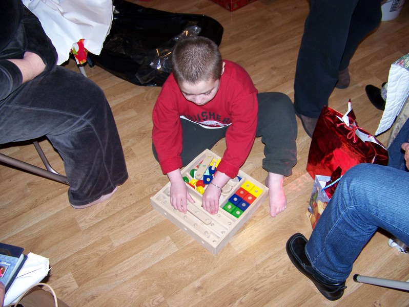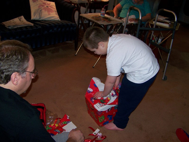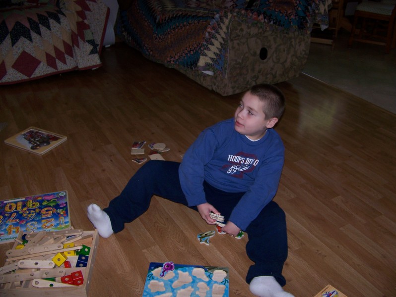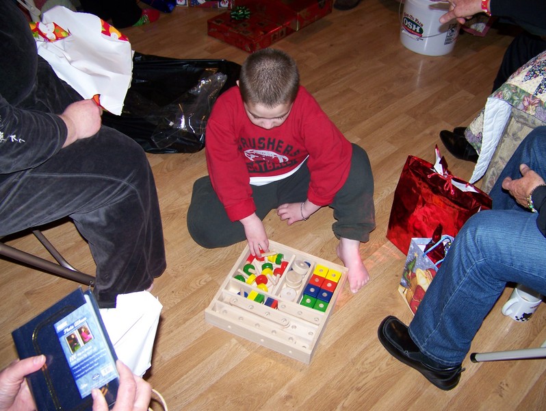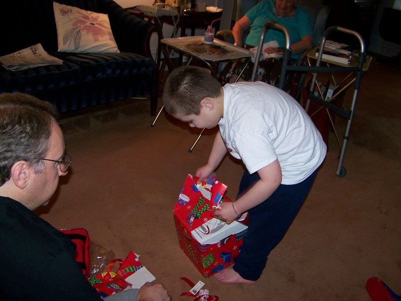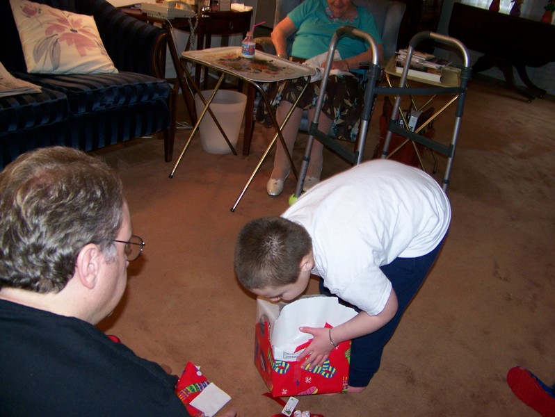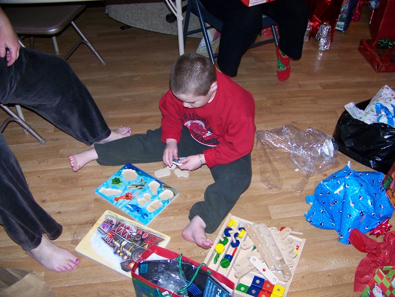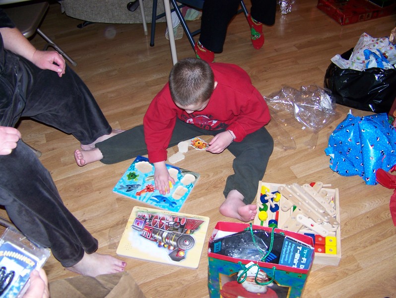 (Posted 1/27/08) Taken 1/18/2008. Alex opening some of his birthday presents. These were educational puzzles from Alex' Great-grandma Tootie.