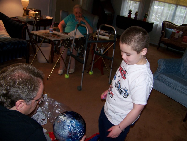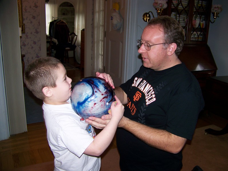 (Posted 1/27/08) Taken 12/29/2007. We had a make-up Christmas celebration at Jeff's grandparents' house in Berkeley. (Alex had been sick on Christmas Day.) Alex got his first bowling ball so that he and dada can go bowling on Sundays.