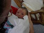 His third day in this world. Rare shots of Jeff holding the baby instead of the camera. More visits with Jeff's folks and shot of Cruz holding the baby. Looking a little suspicious after Julie gave him some food. And of course, looking cute in the receiving blanket Jeff's mom cross-stitched for him as a baby.