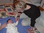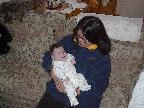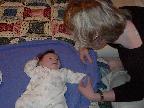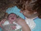 (Posted 4/8/02) March 12--Chrissy came out in the late afternoon to get some one-on-one time with her new nephew. She helped us feed him and give him a bath. And then she played peekaboo with the little guy. Lori got a kick out of it because it seems Chrissy and I play peekaboo the exact same way, without having talked about it or anything! We must have both learned it from our mom or grandma when we were little ourselves.