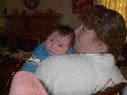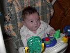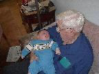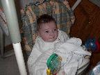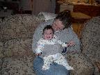 (Posted 2/6/02) Looking cute while snorking down the food. Meeting Lori's Grandma Tootie. Looking suspiciously at Jeff's mom after she gave him a bath. His hair lightens a shade every time we bathe him. It's looking more and more red, ala Lori. Fortunately, his eyes are still Jeff's shade of blue!