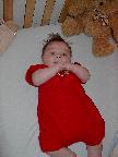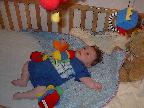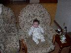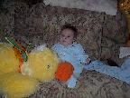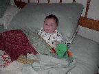 (Posted 3/9/02) Looking cute, checking out the mobile, sitting up in the rocking chair, trying to grab the TV remote, stealing dad's spot in bed, and getting attacked by giant stuffed duckie.